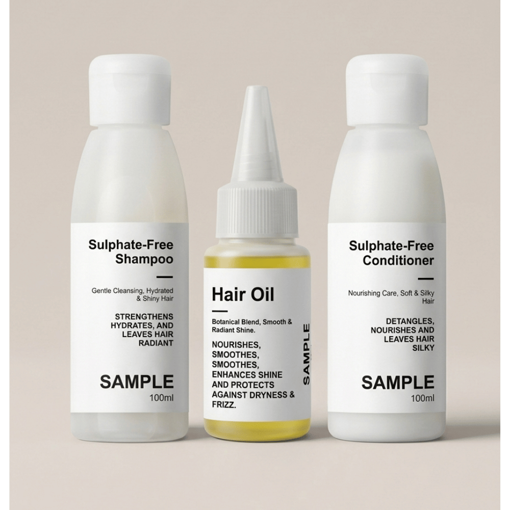 This bundle includes 1x 100ml sample of our sulfate-free shampoo, 1x 100ml sample of our conditioner, and 1 x 30ml Sample of our luxury hair oil, designed to cleanse, nourish, and strengthen your hair from root to tip. Perfect for all hair types, this set lets you experience gentle, hydrating care and natural shine before committing to full-size products.